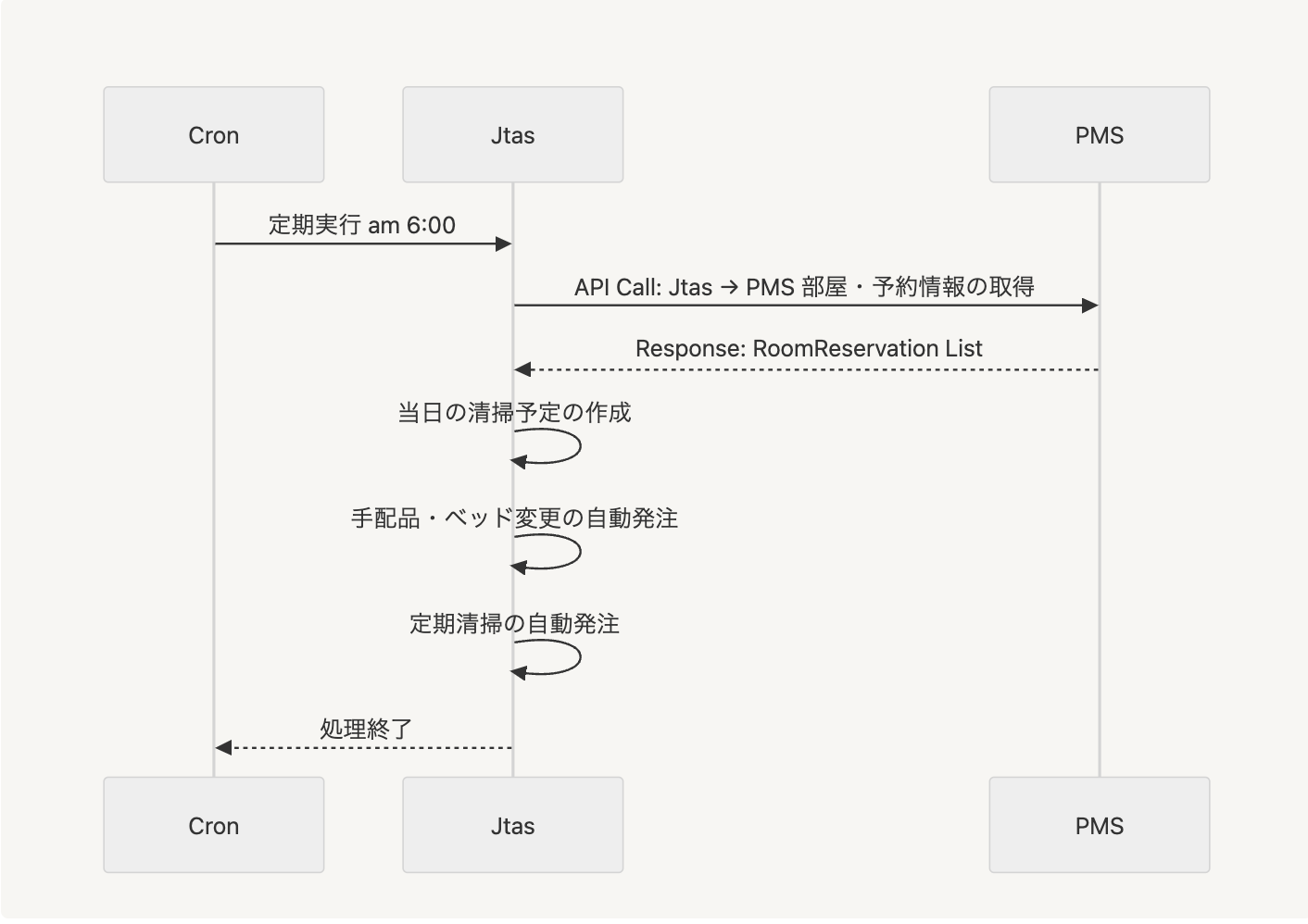 Jtasでは朝時点の部屋ステータスをもとに自動的に清掃指示書を作成します。その際に、最新のデータ取得のためJtas → PMS 部屋・予約情報の取得({PMS}/rooms)のAPIを呼び出します。