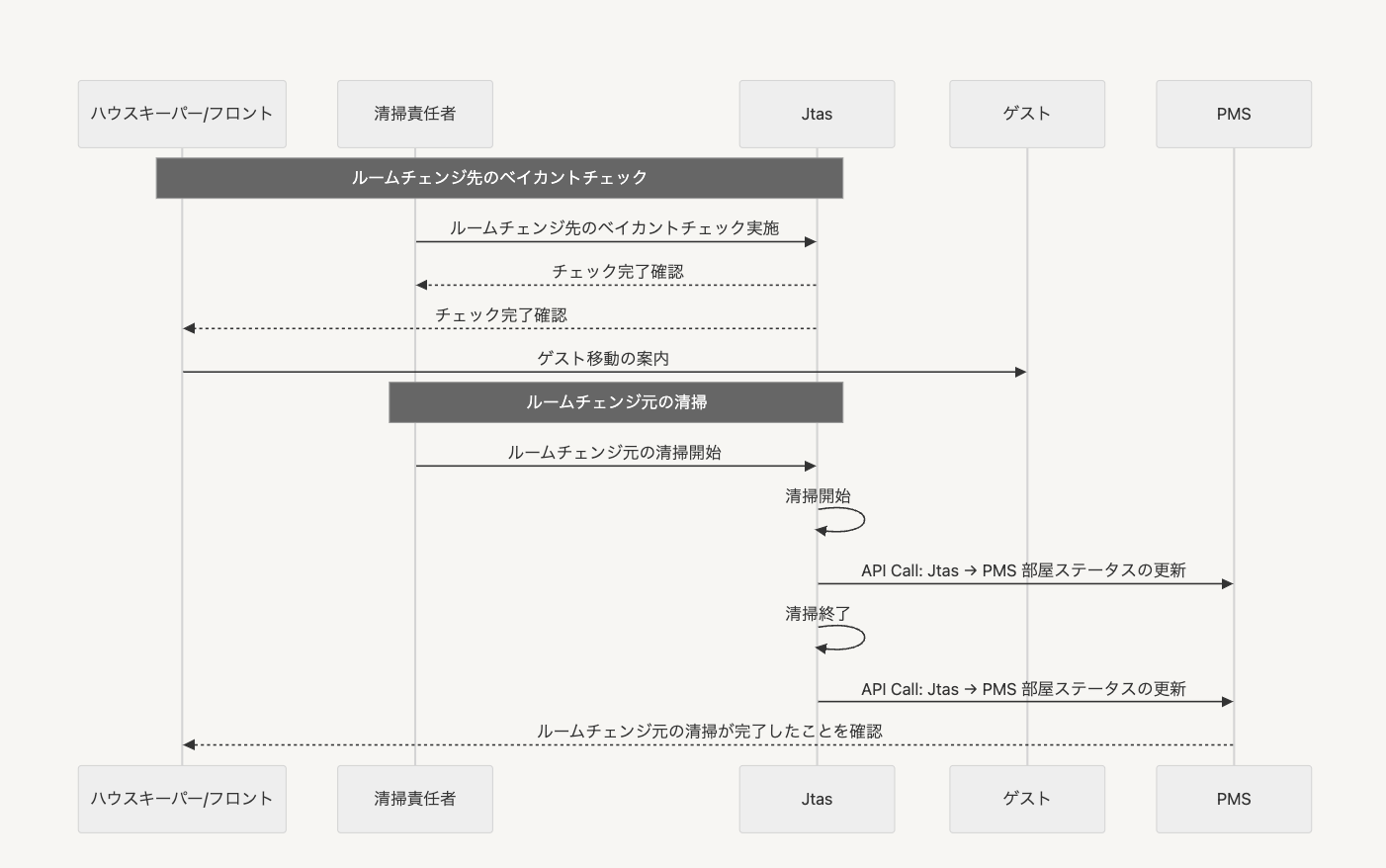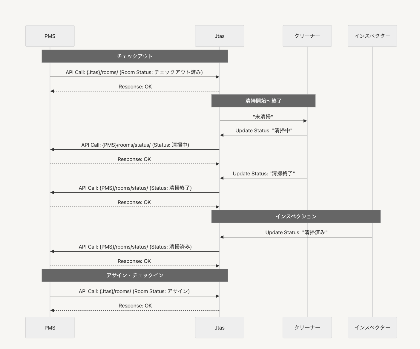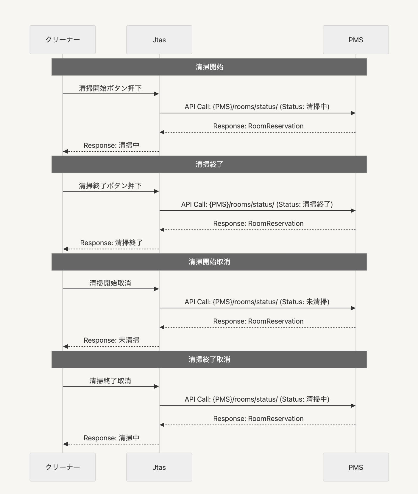 ※清掃不要も基本的にはDDと同じで、フロントがJtasを操作したデータがPMSにapi callされる連携フローを想定しています。