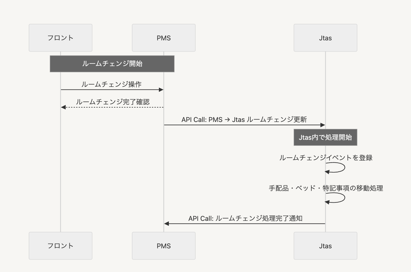 PMS上でルームチェンジした場合は手配品・特記事項などの清掃付随データを引き継ぐためにルームチェンジAPIを呼んでいただく必要があります。