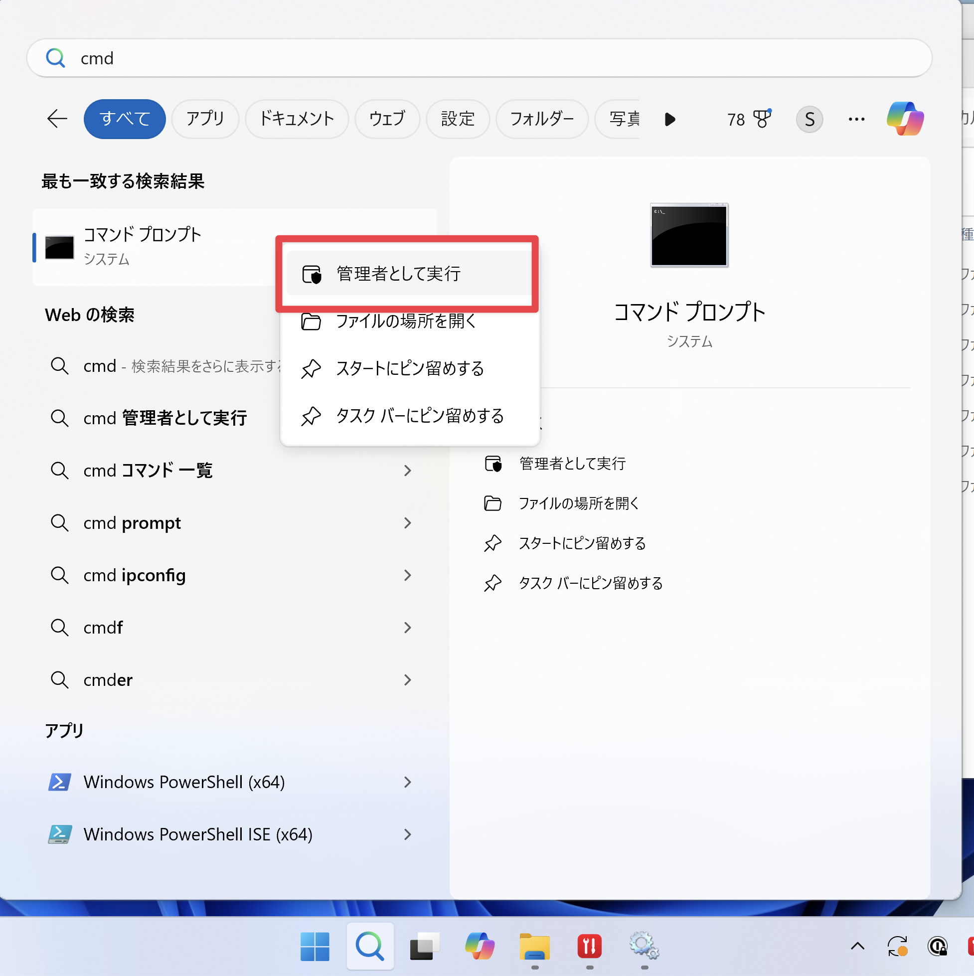 検索から「cmd」と入れて、コマンドプロンプトを右クリックして管理者で実行します。