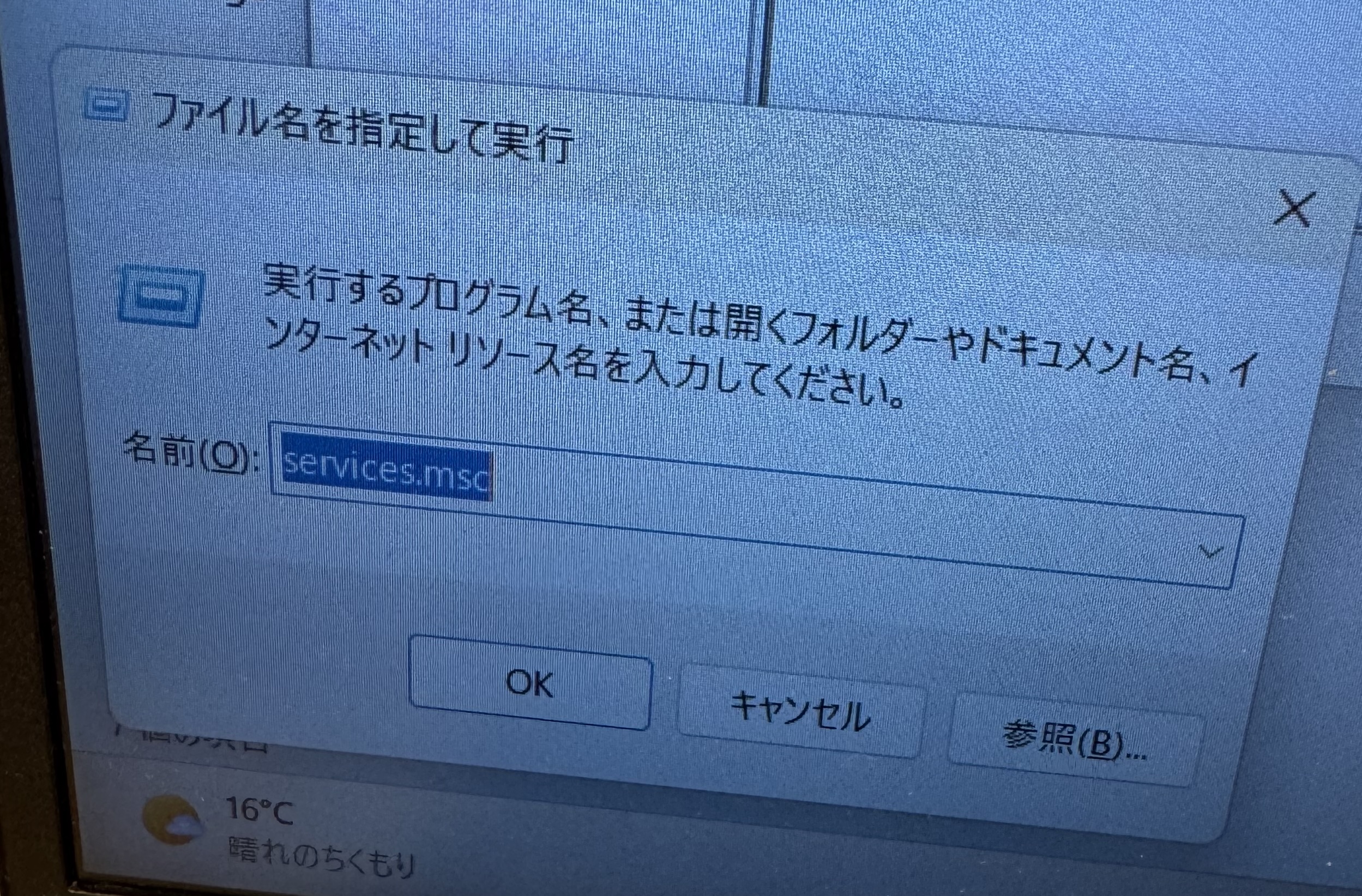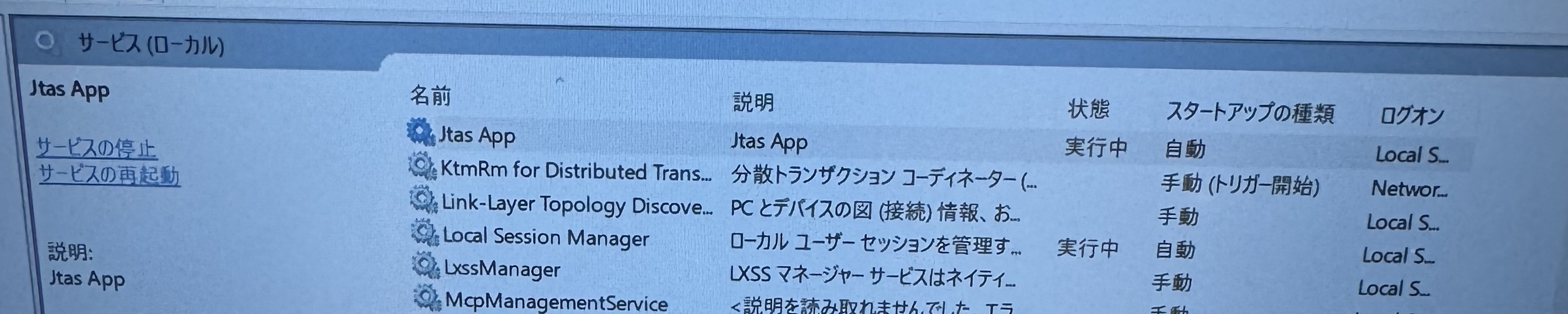 PCを再起動し、services.mscを実行してJtasAppが立ち上がっているか確認します。