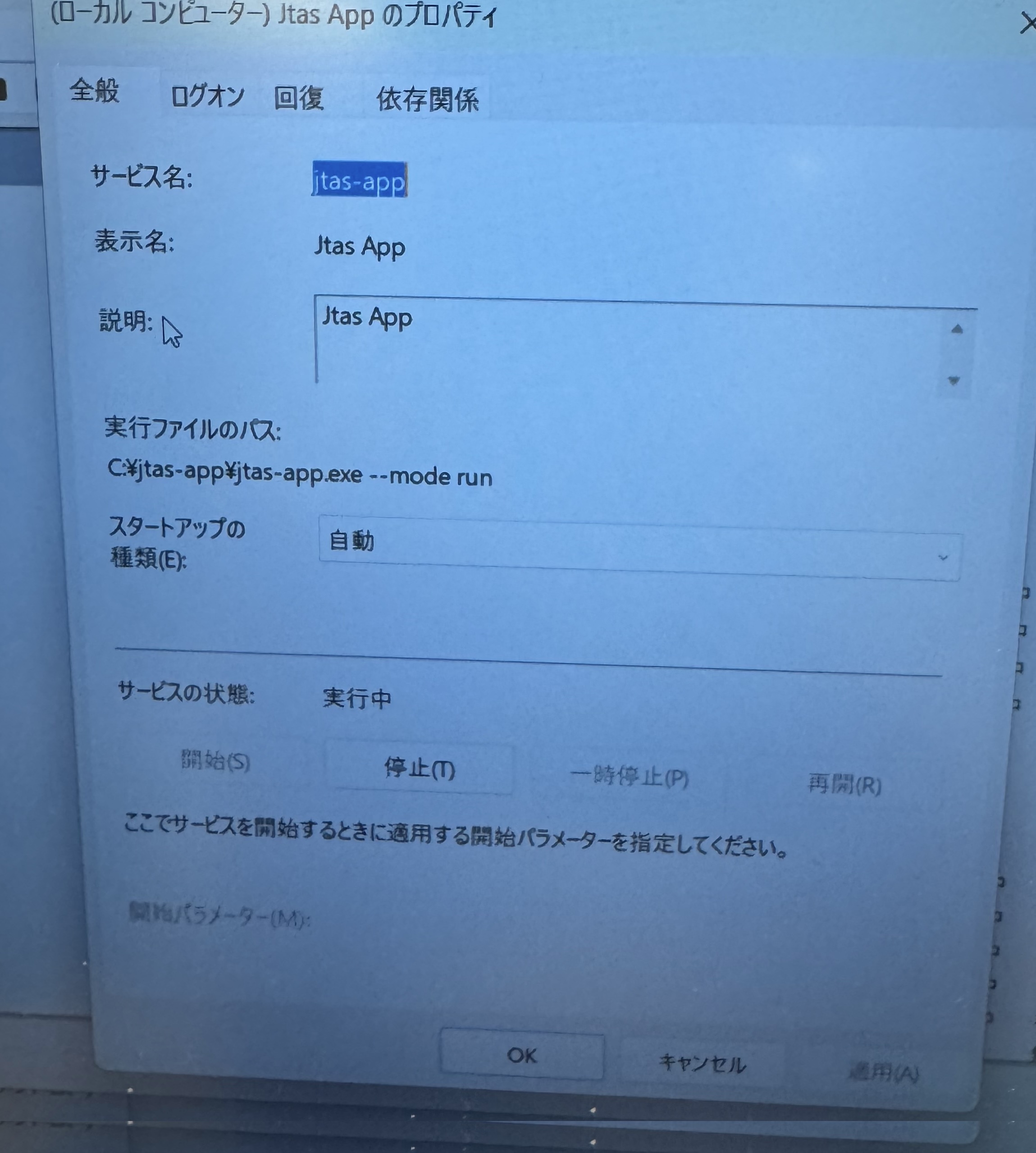 2024-12-02T20:18:47.932418500+09:00 INFO jtas_app - Service installed successfullyJtasAppはサービスで動作します。