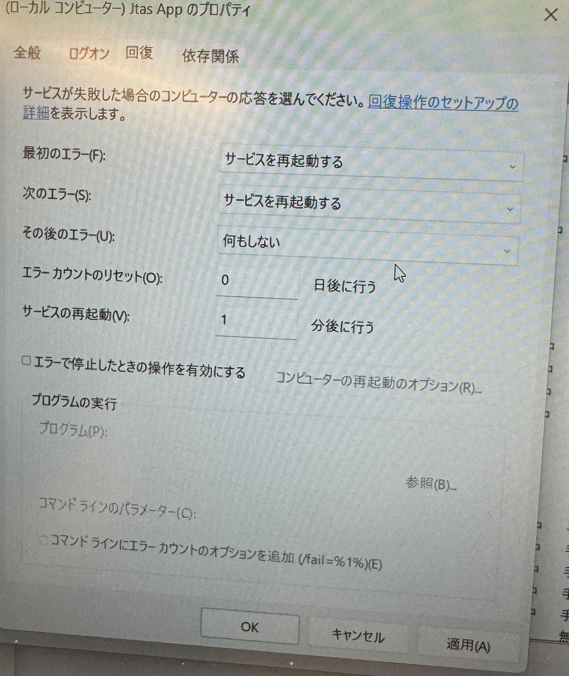 d.回復タブで、最初のエラーと次のエラーを「サービスを再起動する」に変更する。本設定をすることでPCが起動すると実行中となります。