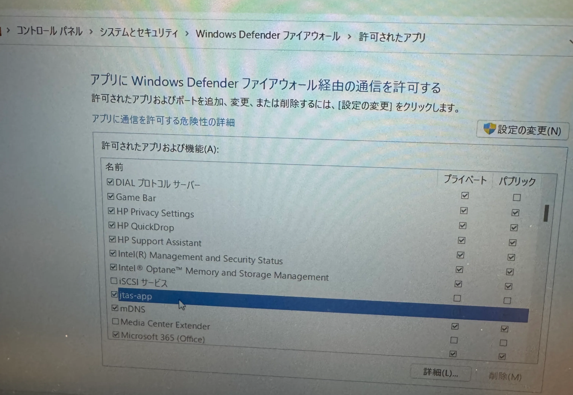 ネットワークのセキュリティ対策にWindows Defenderを使っている場合、ファイアウォール経由の通信を許可するの設定を追加します。コントロールパネル>システムとセキュリティ>Windows Defenderファイアウォール>許可されたアプリ>設定の変更で、jtas-appに対して、パブリック・プライベートの許可を与えてください。