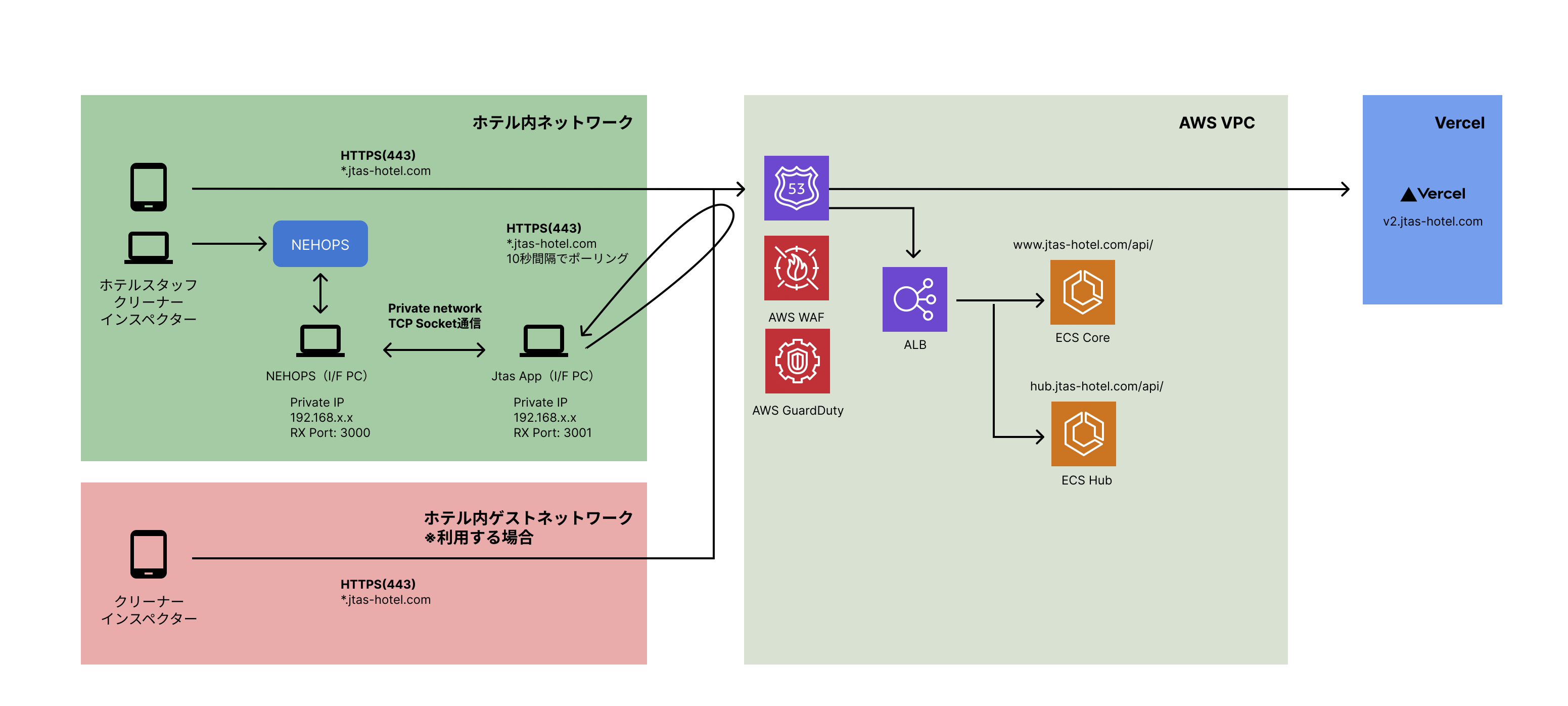 JtasサービスのURLはhttps://v2.jtas-hotel.com/ になりますが、裏側では様々なURLにアクセスしています。 アクセス制御がかかっている環境においては、以下のURLを許可してください。 Jtasサービス - https://www.jtas-hotel.com - https://v2.jtas-hotel.com - https://media-jthotel-prod-resized.s3.amazonaws.com - https://media-jthotel-prod.s3.amazonaws.com - https://www.google-analytics.com - https://api.channel.io - https://o1081443.ingest.sentry.io ヘルプサイト - https://help.jtas-hotel.com/