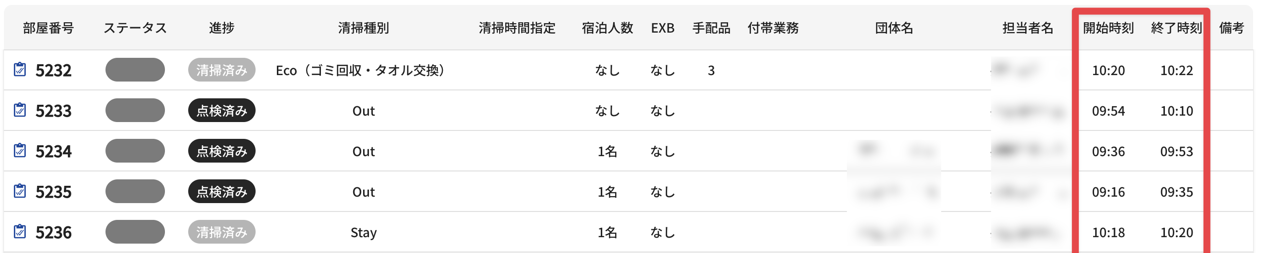 PBXやVODを使用して、清掃開始や清掃完了を送信すると、Jtas上で清掃開始・完了時刻が自動で取得され、Jtas上のステータスも合わせて変更されるようになります。