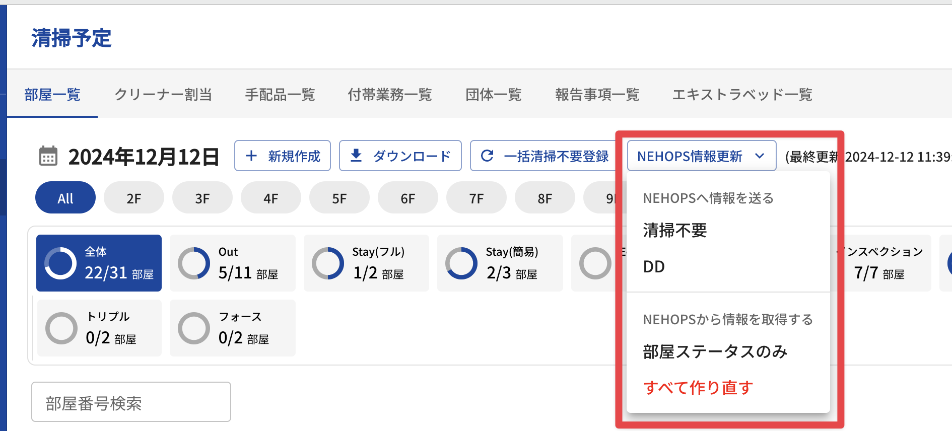 Jtasで清掃開始や清掃完了、インスペクション完了を入力すると、NEHOPSにステータスが連携されるようになります。